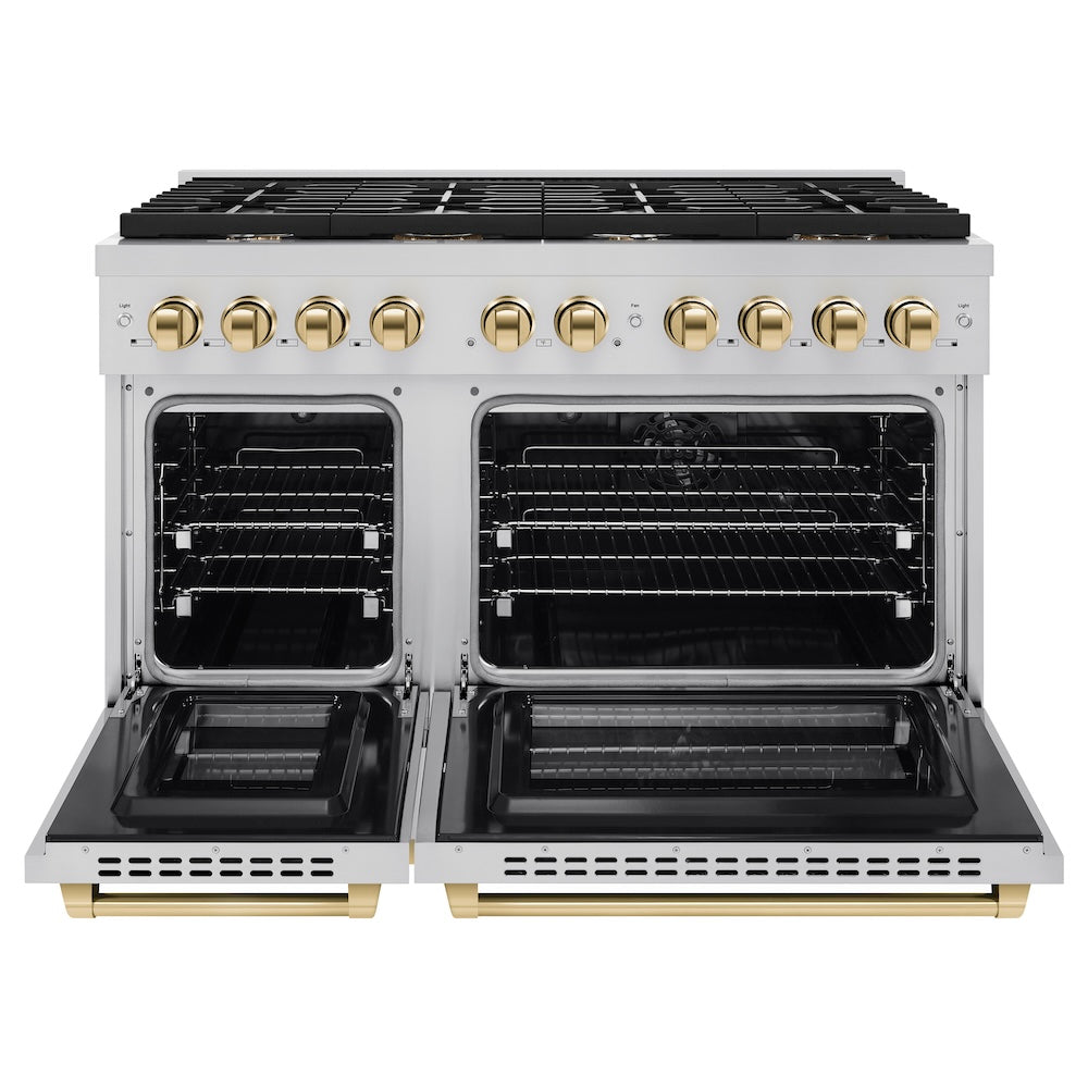 ZLINE Autograph Edition 48 in. 6.7 cu. ft. Paramount Dual Fuel Range with 8 Burner DuoPro™ Cooktop and Dual Ovens in Stainless Steel and Polished Gold Accents (PSDRZ-48-G)